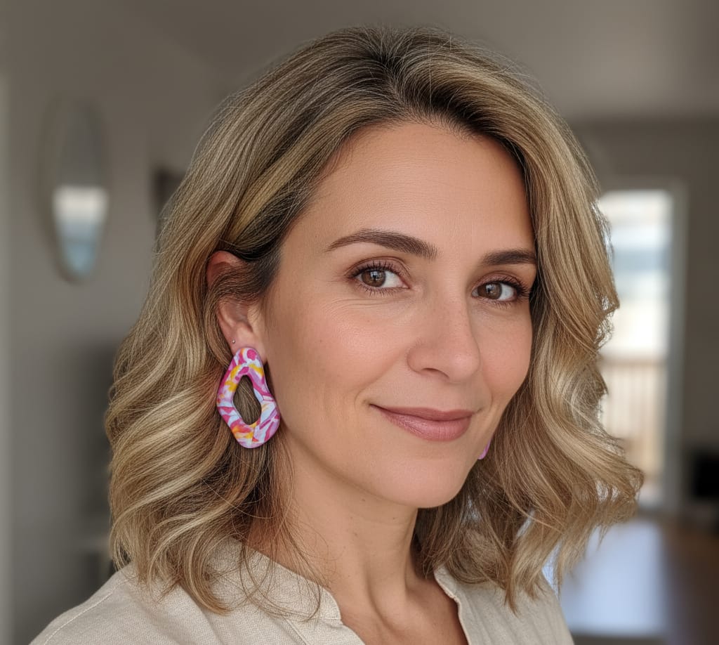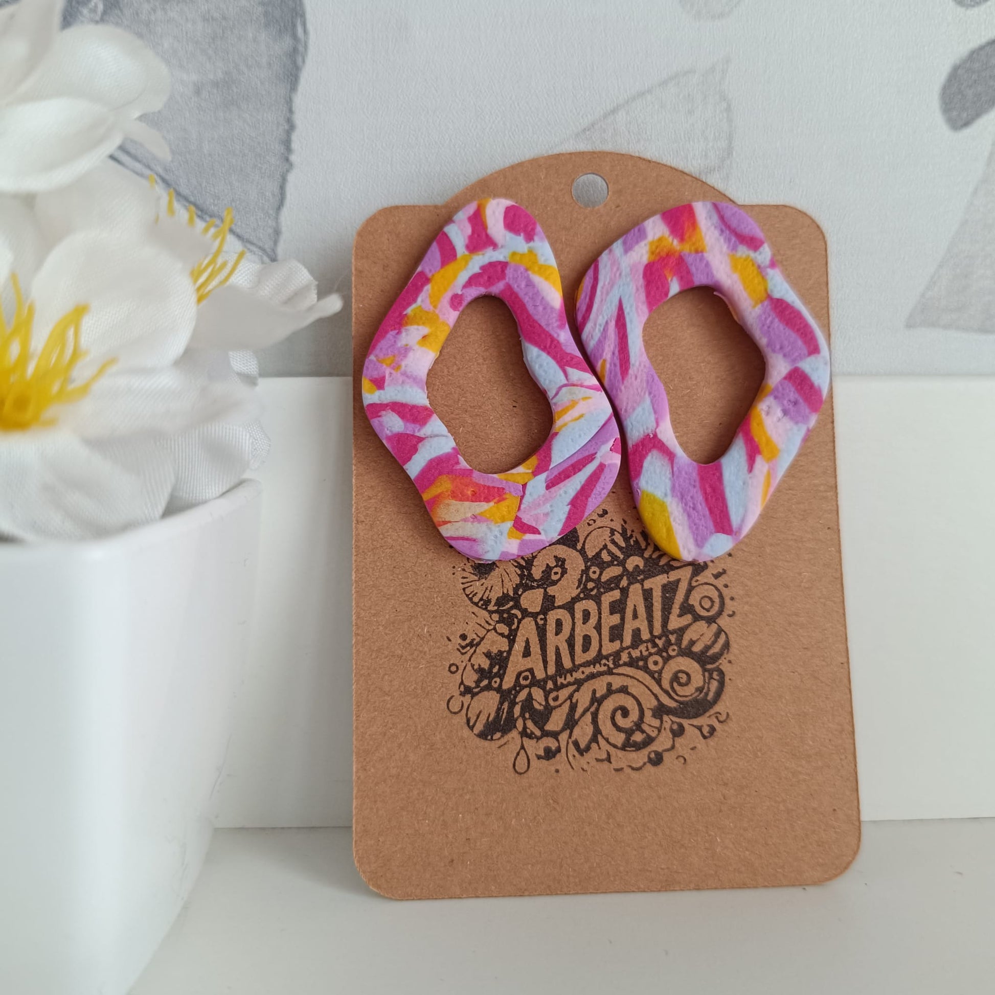 Pendientes de arcilla polimérica hechos a mano en tonos rosa.